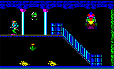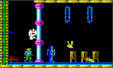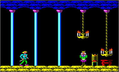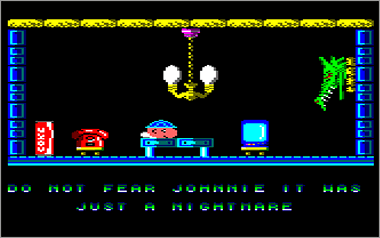 Como curiosidad, decir que este juego tiene un final real, más allá del típico «Felicitaciones» tan común en los programas de 8 bits. Si logramos terminarlo seremos obsequiados con una simpática pantalla en donde se nos cuenta que todo ha sido un mal sueño y en la que aparecen los objetos recogidos a lo largo de la aventura. El personaje que se muestra en la captura también será familiar para más de uno :D.