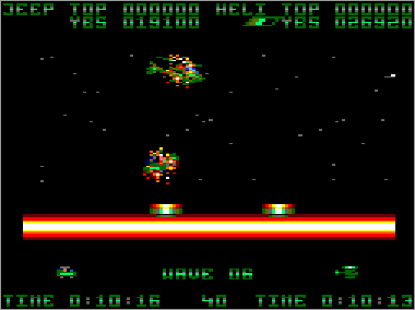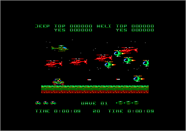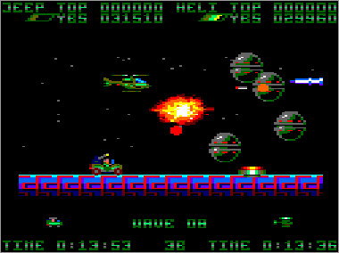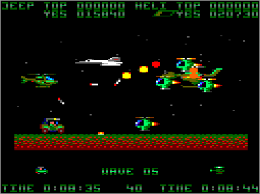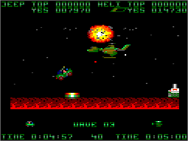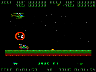Si bien en la máquina los terrenos por donde discurre la lucha son bastante variados e incluyen montañas, mares, desiertos y demás paisajes variopintos, a la hora de realizar la conversión Nigel Brown decidió eliminar todo esto de un plumazo y crear fases de orografía totalmente lisa, sin ningún tipo de fondo o decorado, excepto algunas estrellas perdidas por aquí y por allí. Además, se tomó la libertad de elegir libremente la textura de los terrenos sobre los que se desplaza el jeep, que en algunos casos están bastante bien resueltos y en otros son sencillamente demenciales. La verdad, el asunto supuso un buen fiasco, sobre todo teniendo en cuenta que el Amstrad puede mover perfectamente escenarios mucho más complejos (sólo hay que ver el P-47 Freedom Fighter). En fin, vamos a observar cada uno de los niveles.