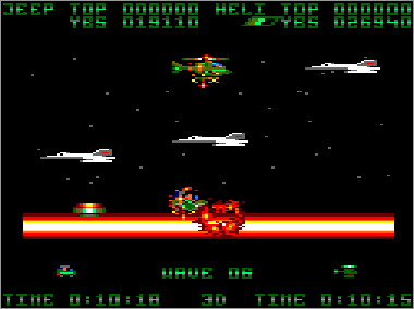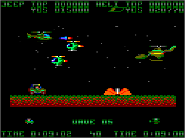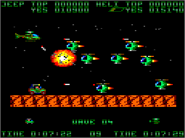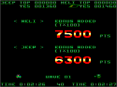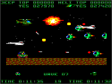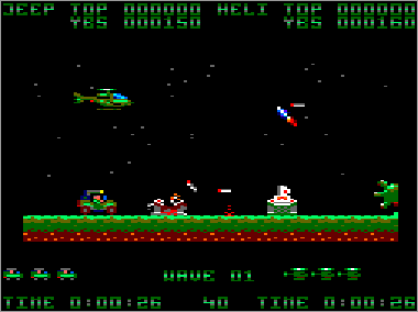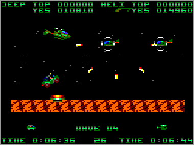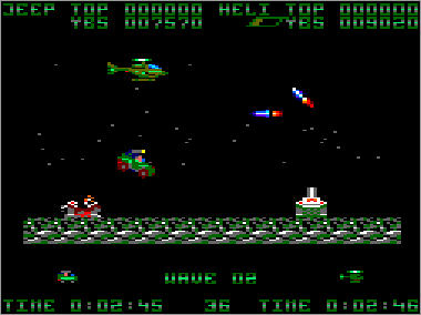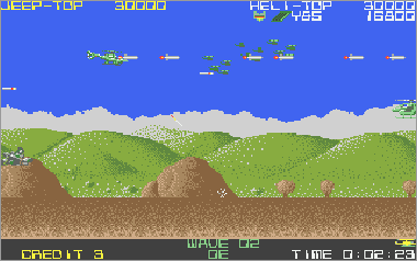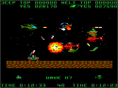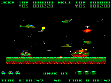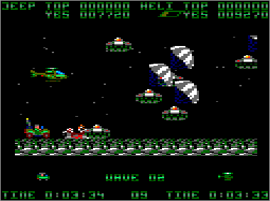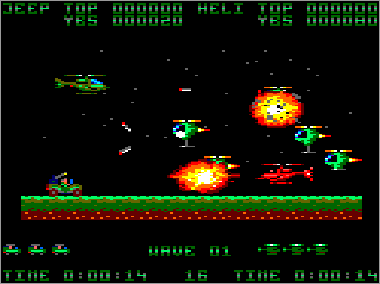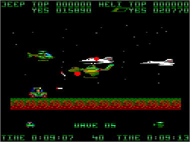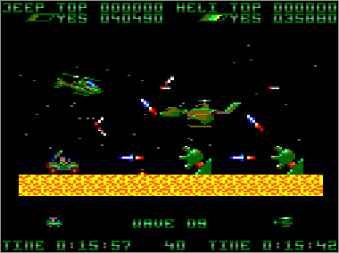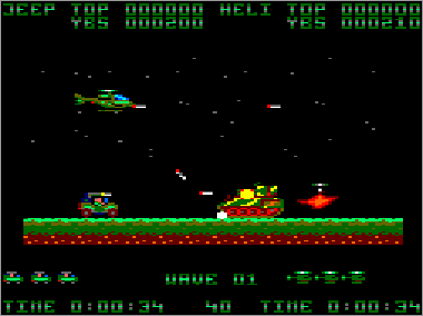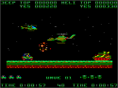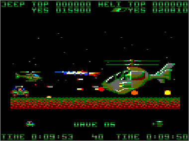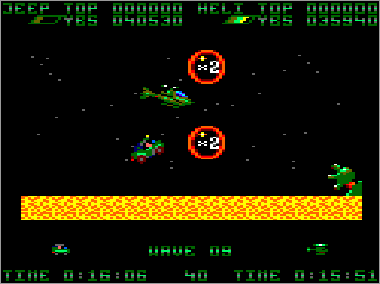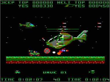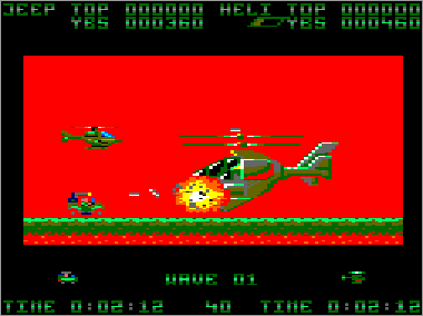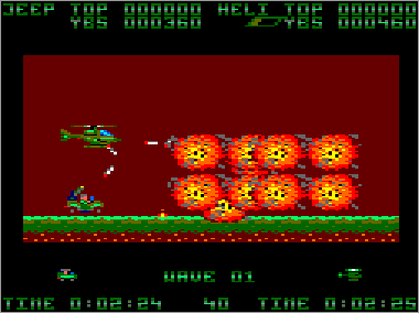 Asumiendo que juguemos en modo cooperativo (algo muy recomendable, ya que es prácticamente imposible progresar sólo con un vehículo) nada más comenzar la partida veremos al helicóptero sobrevolando la parte superior de la pantalla mientras que su aliado el jeep se desplaza rodando por el suelo. Ambas máquinas serán, desde el primer momento, imprescindibles para avanzar y deberán prestarse funciones de apoyo de forma constante. Como era de esperar, el helicóptero tiene total libertad de movimiento (amén de una mayor potencia de fuego) y, aunque no puede aterrizar, es capaz de volar casi a ras de tierra. El jeep, por su parte, puede saltar considerablemente, algo que será indispensable en ciertas ocasiones para superar obstáculos (especialmente minas) y, además, posee una torreta móvil que le permite seleccionar con total precisión la dirección de sus disparos (los del helicóptero son invariablemente frontales y en ángulo de 45º respecto al suelo).