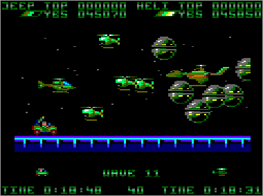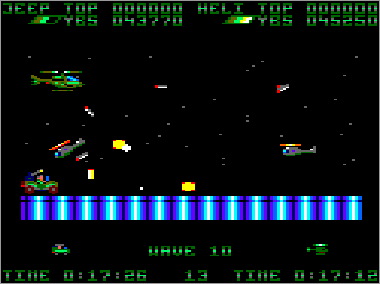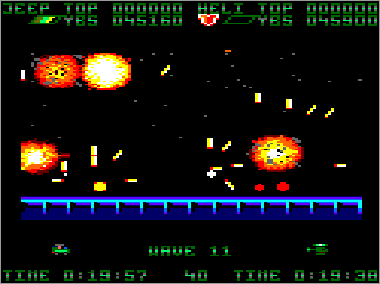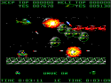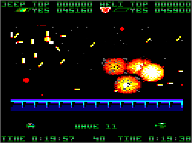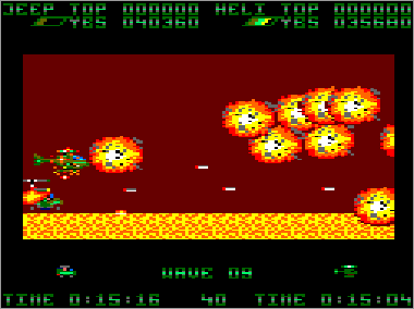 El aspecto jugable brilla con luz propia. La diversión está más que asegurada si decidimos unir nuestras fuerzas a las de algún amigo, ya que las acciones de colaboración-protección mutua son constantes desde el primer momento. La perfecta respuesta de nuestros vehículos, así como el ajustado grado de dificultad, también permiten que cada vez podamos avanzar un poco más. Por otra parte, todos los adversarios tienen patrones de actuación fijos, así que cada oleada o combinación de enemigos puede superarse de una cierta forma. Terminar el juego es, por tanto, una cuestión de pericia y paciencia, pero resulta una tarea totalmente posible. De hecho, yo lo acabé hace muchos años, durante un verano que me dediqué a quemarlo todas las noches con mi primo. Creo que fue uno de los programas que más satisfacción me aportó cuando lo finalicé, a pesar de su cutre final. Eso sí, que nadie intente jugar tan sólo con el jeep o el helicóptero, porque estará perdido. Si estamos sólos, lo mejor es utilizar los dos vehículos a la vez, asignándoles los mismos controles, e ir manejándolos como podamos.