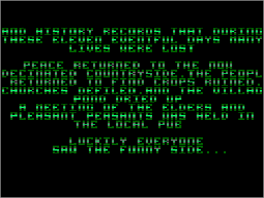 El sonido no es especialmente llamativo. Cuando carga el programa se escucha, a modo de presentación, una «música» que juzgo totalmente horrenda. Durante el juego los efectos se limitan a los típicos estallidos y el sonido de los disparos. A pesar de ello, toda la parafernalia sonora acompaña perfectamente a la acción y, la verdad, no se echa de menos una mejor realización en este punto. Lo único realmente criticable es, a mi modo de ver, la terrorífica canción del juego, pura mezcla de pitidos y ruidos extraños.
